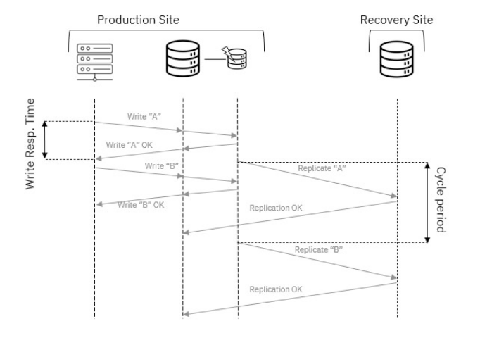 Asenkron modda, recovery site’daki veriler production site’ın gerisinde kalabiliyor, çünkü son cycle’dan sonra yapılan değişiklikler henüz aktarılmamış olabiliyor. Örneğin, Recovery Site “A” verisini işlerken Production “B” yazıyorsa, “B” ancak bir sonraki cycle’da recovery site’a ulaşıyor. (Görsel-2)
