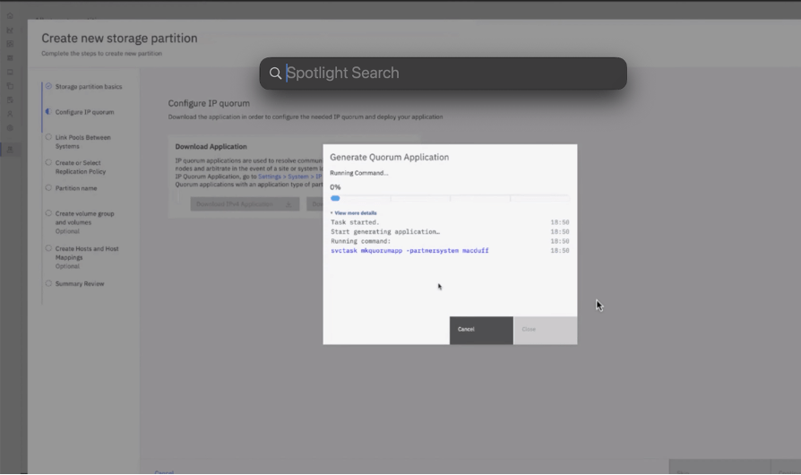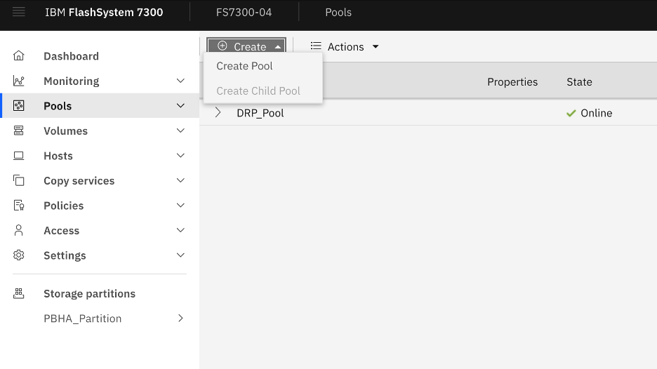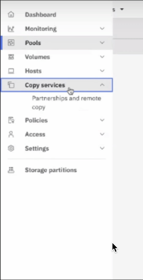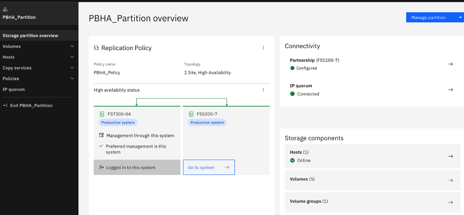 İki storage arasındaki bağlantı tanımı, iş birliği yapıldıktan sonra sıra FlashSystem Grid yapısında bahsettiğim Storage partition oluşturmaya geldi. Görsel-8’de görüleceği gibi sol attan storage partitions alanına gidip, Create partition ile ilerliyoruz.